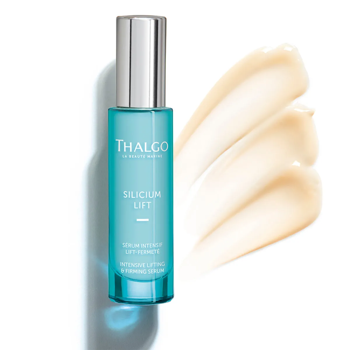 Intenzivní liftingové a zpevňující sérum Thalgo Silicum Lift s vysokou koncentrací řasového komplexu bohatého na mořské silicium a vitamin C vyhlazuje pleť, navrací jí svěží vzhled a pozvedá kontury. Extrakt hnědé řasy Pelvetia canaliculata obnovuje pružnost pleti. Potlačuje enzymy zodpovědné za rozklad elastinu a stimuluje syntézu kolagenu a kyseliny hyaluronové. Lehká mléčná emulze s jemně naoranžovělou barvou se rozplývá na pleti.