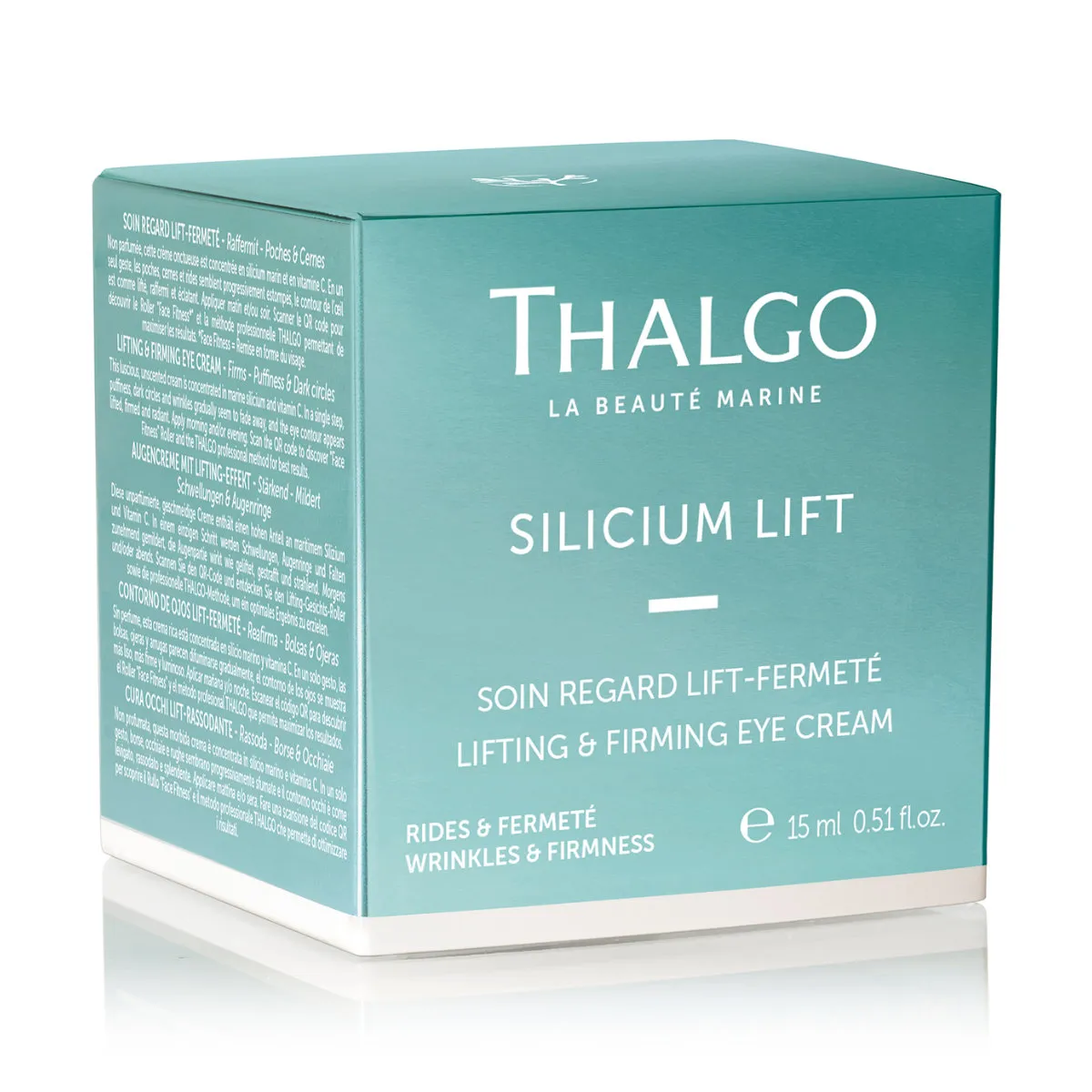 Liftingový a zpevňující krém na oční okolí Thalgo Silicium Lift s obsahem řasového komplexu bohatého na mořské silicium a vitamin C zpevňuje a posiluje oční kontury, redukuje vrásky a jemné linky. Ferment mikroorganismu ze slanorožce působí proti otokům a tmavým kruhům. Zlepšuje oběh a zamezuje hromadění melaninu, který způsobuje mdlý vzhled. Přepychová textura se rozplývá na pleti a nezanechává mastný finiš. Bez parfemace.