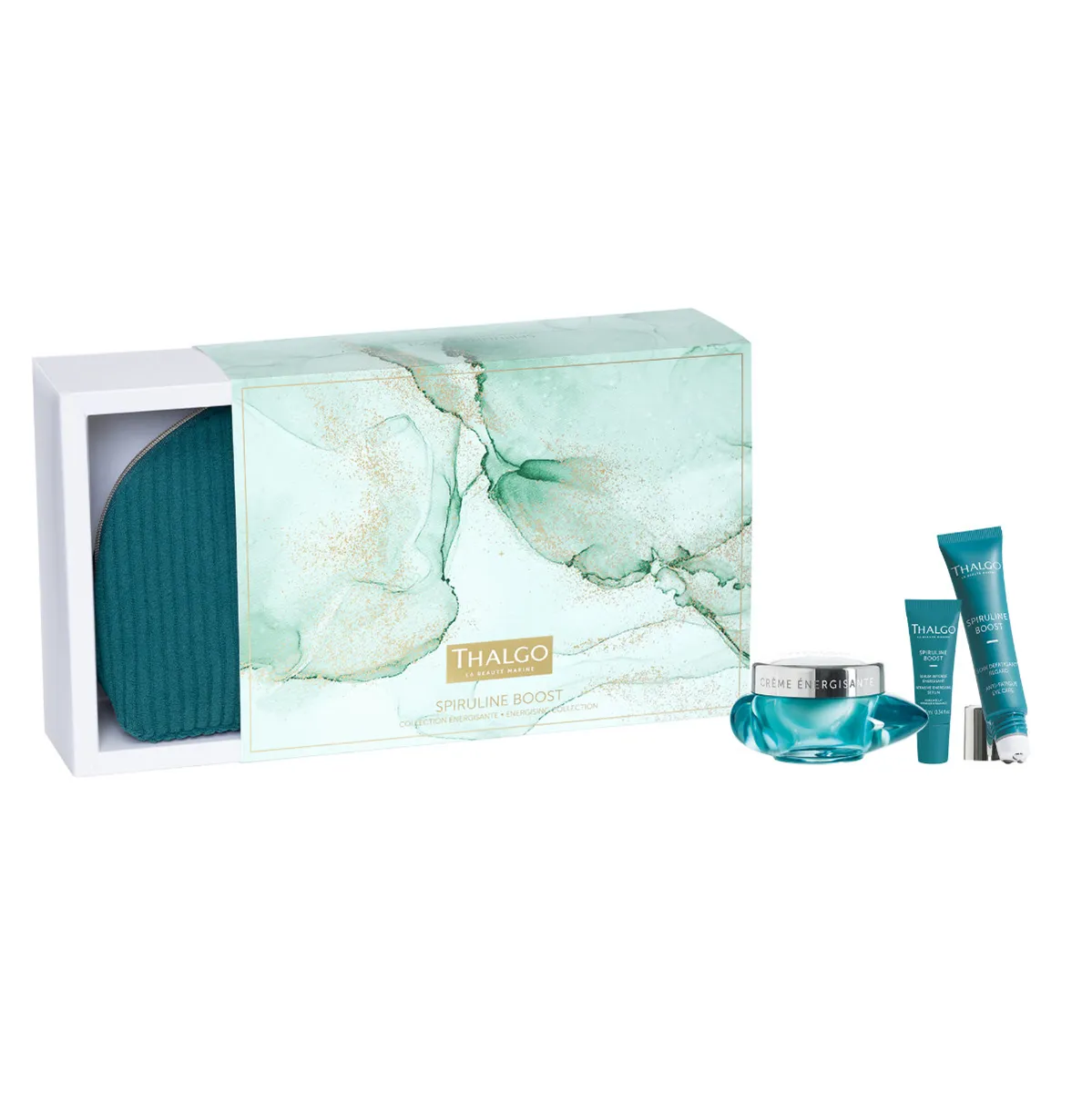 Set pleťové kosmetiky obsahuje:Spiruline Boost Energizující krém 50 mlSpiruline Boost Intenzivní energizující sérum 10 mlSpiruline Boost Gel na unavené oční okolí 15 mlSametová kosmetická taštičkaPoužití: Sérum aplikujte ráno a večer na čistou pleť, poté naneste gel-krém. Oční gel jemně vklepejte do oblasti kolem očí.Řada Spiruline Boost využívá sílu mořské spiruliny, bohaté na antioxidanty, a mořského magnézia. Pomáhá chránit pleť před stresovými faktory, redukuje známky únavy a navrací jí vitalitu a jas.Thalgo je přírodní kosmetika z mořských řas a minerálů pro přirozenou a účinnou péči o vaši pleť.