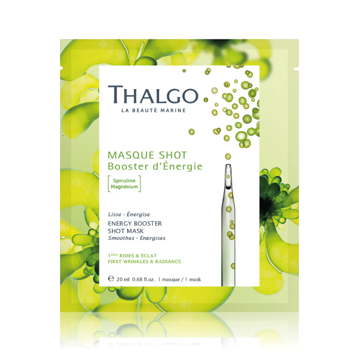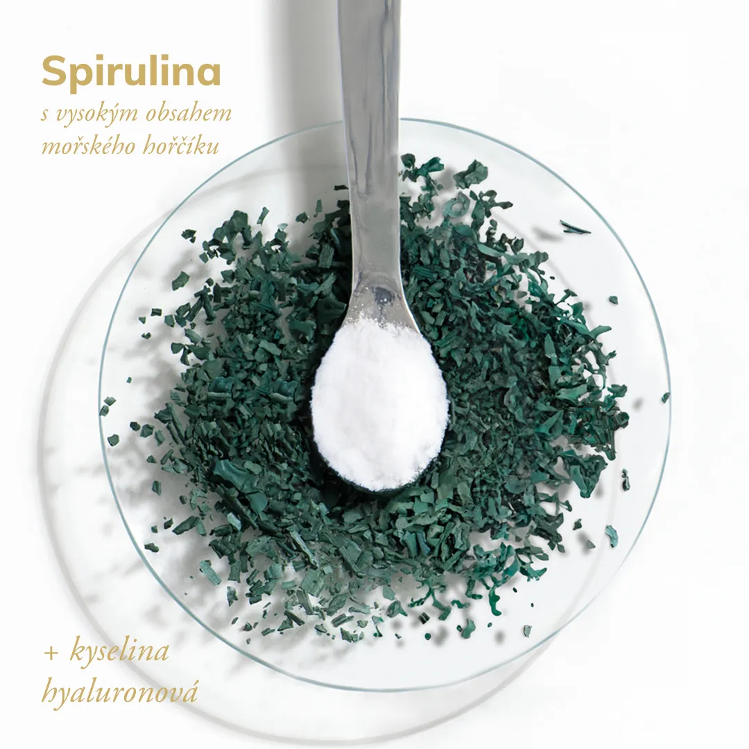 Mořská maska s alginátovými vlákny vyhlazuje první vrásky a navrací pleti jas. Zelenomodrá mikrořasa spirulina v kombinaci s mořským magnéziem má energizující a antioxidační účinky. Kyselina hyaluronová o vysoké molekulární hmotnosti vyhlazuje povrch pleti, minimalizuje výskyt prvních vrásek a obnovuje zářivost. Má energizující mořskou vůni.
